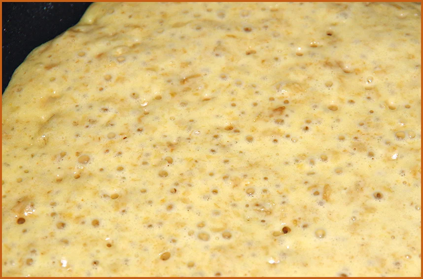 After about two minutes there should be lots of little air holes showing up on the pancake as it cooks (see picture). At this stage check the underneath and if it's golden brown then flip the pancake over.