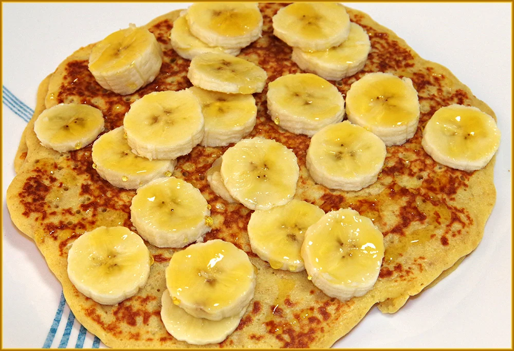 After you have made both pancakes then you can slice up the banana and put it on the top, and then drizzle over the slightest hint of Golden Syrup. I generally don't have very much of a sweet-tooth so I don't like to use too much Golden Syrup but I have to tell you: Golden Syrup over banana is a taste sensation.